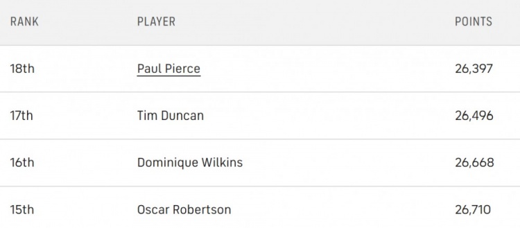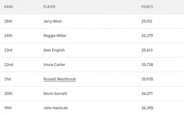 這是一個總得分非常接近的群體,而且這些球員都已退役,因此我們不需要擔心積分差距發生變化。庫里需要再得到1694分才能超越奧斯卡-羅伯特森并進入前15名。這同樣是一個幾乎確定能達成的目標,甚至有可能在下賽季就實現,只要庫里沒有長時間缺席。本賽季庫里的場均得分是威少的兩倍,即使威少目前總得分更高,庫里也有很大機會先于他超越羅伯特森。