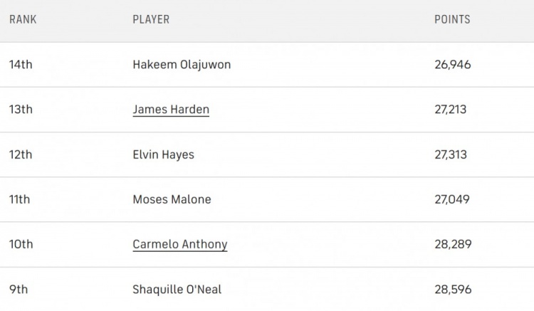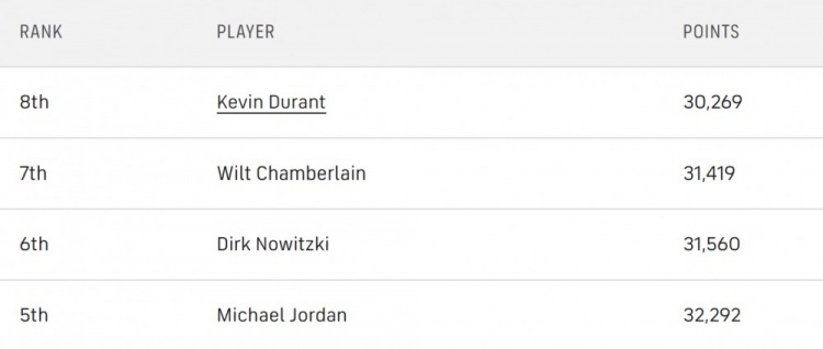 庫里是否有機會再超越其他人?或者達到30000分里程碑?以下是目前得分榜第8到第5位的情況: