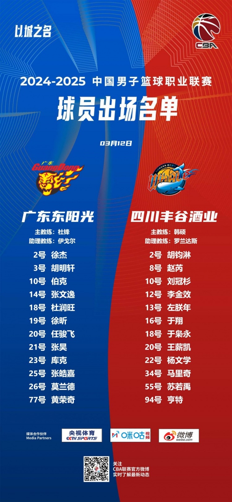 3月12日訊 CBA常規賽,廣東主場對陣四川,賽前雙方公布了本場比賽的大名單。