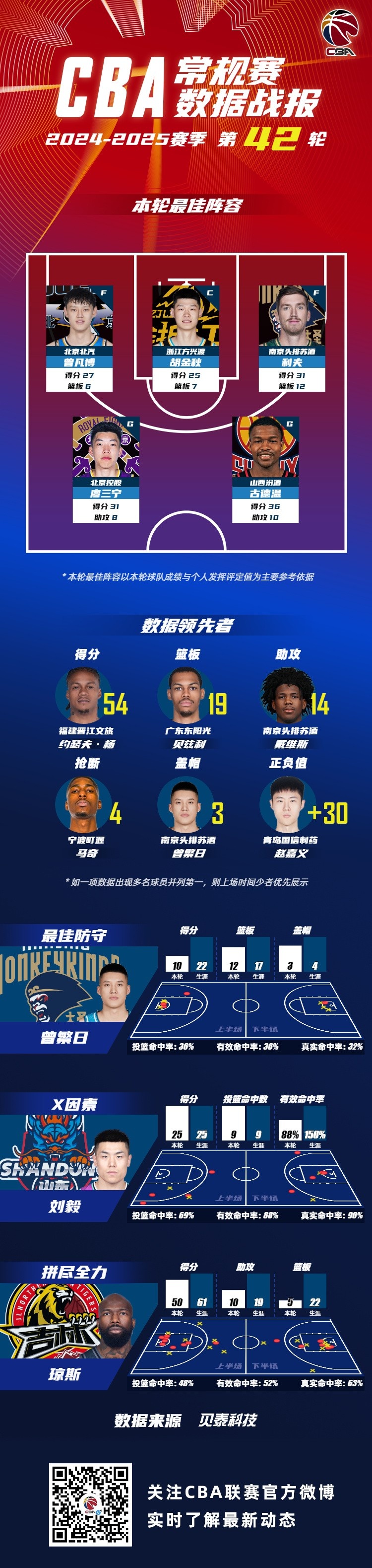 2024-2025賽季CBA聯賽常規賽第42輪結束較量,來自北京首鋼籃球俱樂部的曾凡博 ,浙江廣廈籃球俱樂部的胡金秋,南京同曦籃球俱樂部的利夫,北京控股籃球俱樂部的廖三寧和山西汾酒職業籃球俱樂部的古德溫入選CBA聯賽常規賽第42輪最佳陣容!