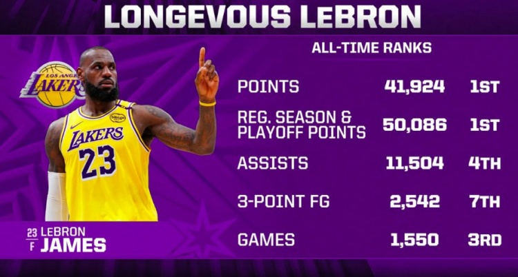 老詹41924分歷史第一;常規(guī)賽+季后賽50086分第一;總助攻11504第4;總三分命中2542個歷史第7;出戰(zhàn)1550場歷史第3