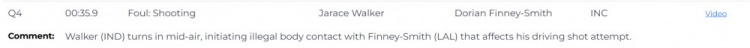 比賽最后35.9秒,湖人118-119落后一分,步行者球員賈雷斯-沃克防守時半空中轉身,與芬尼-史密斯發生非法身體接觸,影響了后者的上籃出手,此為犯規漏吹,芬尼-史密斯應該獲得兩罰。