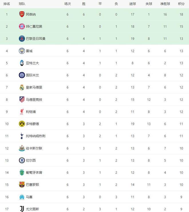 歐冠積分榜:阿森納繼續(xù)全勝領(lǐng)跑,拜仁3分之差位列第二