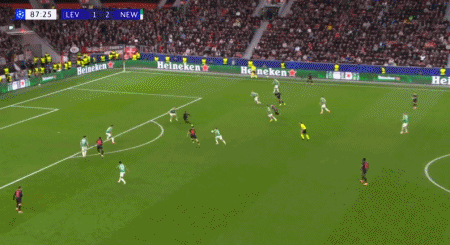 第88分鐘,馬扎助攻,格里馬爾多插射破門扳平比分,勒沃庫森2-1紐卡