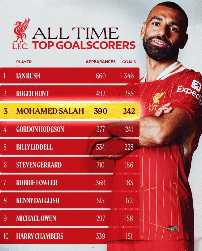 本場比賽取得進球后,薩拉赫已經為利物浦打進242球,躋身紅軍隊史射手榜第三位。