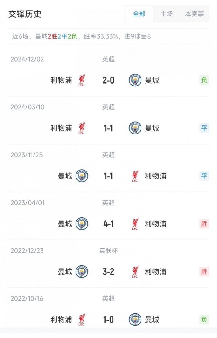 曼城vs利物浦交鋒歷史:利物浦歷史占優,近6次交手雙方各取2勝