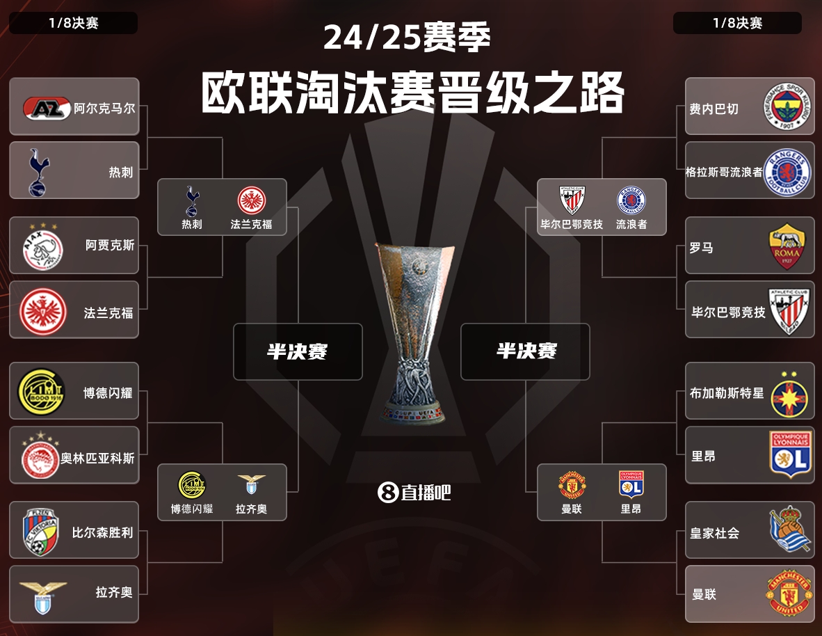 ??歐聯8強對陣:曼聯vs里昂,流浪者vs畢巴,熱刺vs法鷹