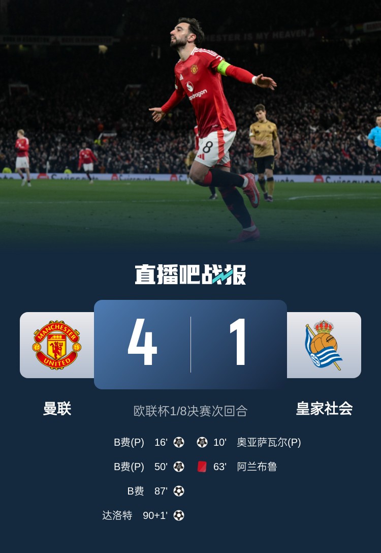 曼聯歐聯杯16強次回合4-1擊敗皇社,總比分曼聯5-2晉級!B費完成帽子戲法。
