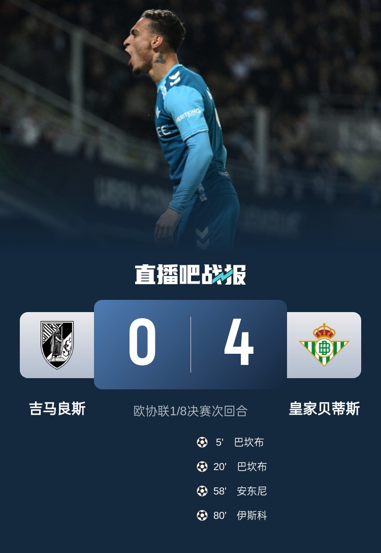 貝蒂斯4-0總比分6-2擊敗吉馬良斯,安東尼傳射+策動兩球!貝蒂斯晉級歐協聯8強!