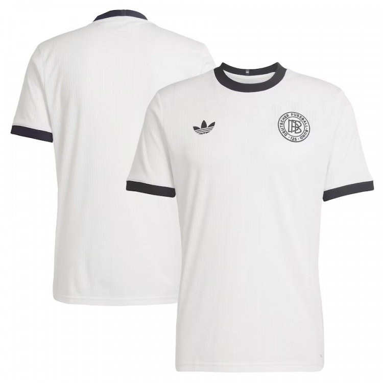 紀(jì)念球衣的設(shè)計以1974年復(fù)古球衣為藍(lán)本——這一年,德國男足國家隊在本土贏得了世界杯冠軍。125周年紀(jì)念球衣的配色和剪裁均承載著德國足協(xié)的歷史:球員版球衣采用經(jīng)典的黑白配色,而守門員球衣則為淡藍(lán)色。球衣采用細(xì)條紋面料,搭配袖口、圓領(lǐng)衣領(lǐng)以及衣領(lǐng)后方的旗幟印花。球衣胸前繡有阿迪達(dá)斯的三葉草標(biāo)志,以及特別為德國足協(xié)成立125周年設(shè)計的刺繡徽章,而該徽章的涉及靈感來自德國足協(xié)在萊比錫成立地所懸掛的紀(jì)念牌匾。