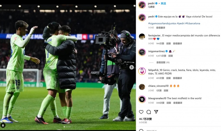 佩德里也曬出自己和隊友的相擁慶祝照,并配文:“這支球隊????????(狀態火爆),多么棒的勝利!太瘋狂了!”