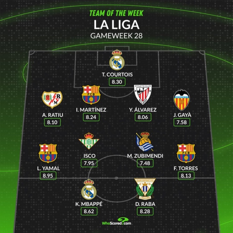 中場:亞馬爾(巴薩,8.95分)、伊斯科(貝蒂斯,7.95分)、祖比門迪(皇社,7.48分)、費蘭(巴薩,8.13分)