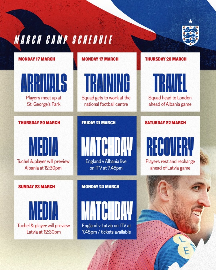 英格蘭本期集訓日程:3月17日集合,將對陣阿爾巴尼亞、拉脫維亞