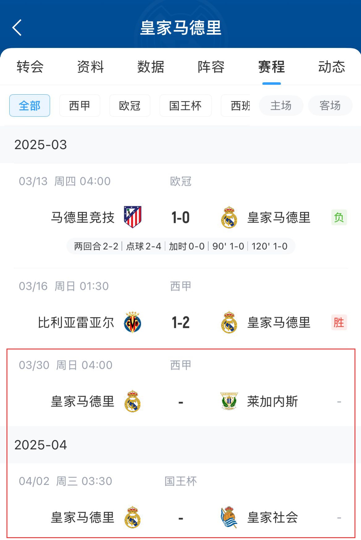 目前的局面是,皇馬未來兩場比賽——聯賽vs萊加內斯以及國王杯vs皇家社會的開球時間只間隔71小時。目前不清楚會發生什么樣的變化。但《馬卡報》表示,皇馬方面似乎堅持自己的立場,如果管理機構不遵循兩場比賽至少間隔72小時的建議,他們將不會參加比賽。