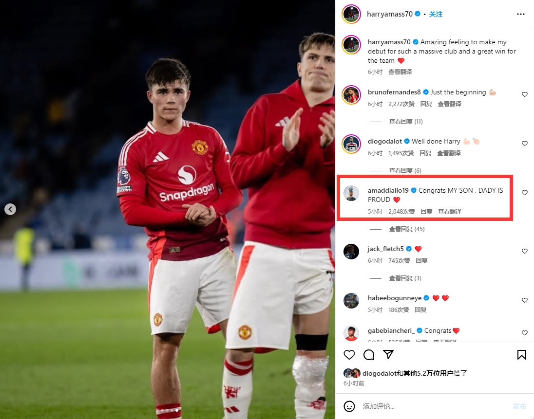 18歲阿瑪斯曼聯首秀,22歲阿瑪德:祝賀我的兒子,爸爸很自豪??