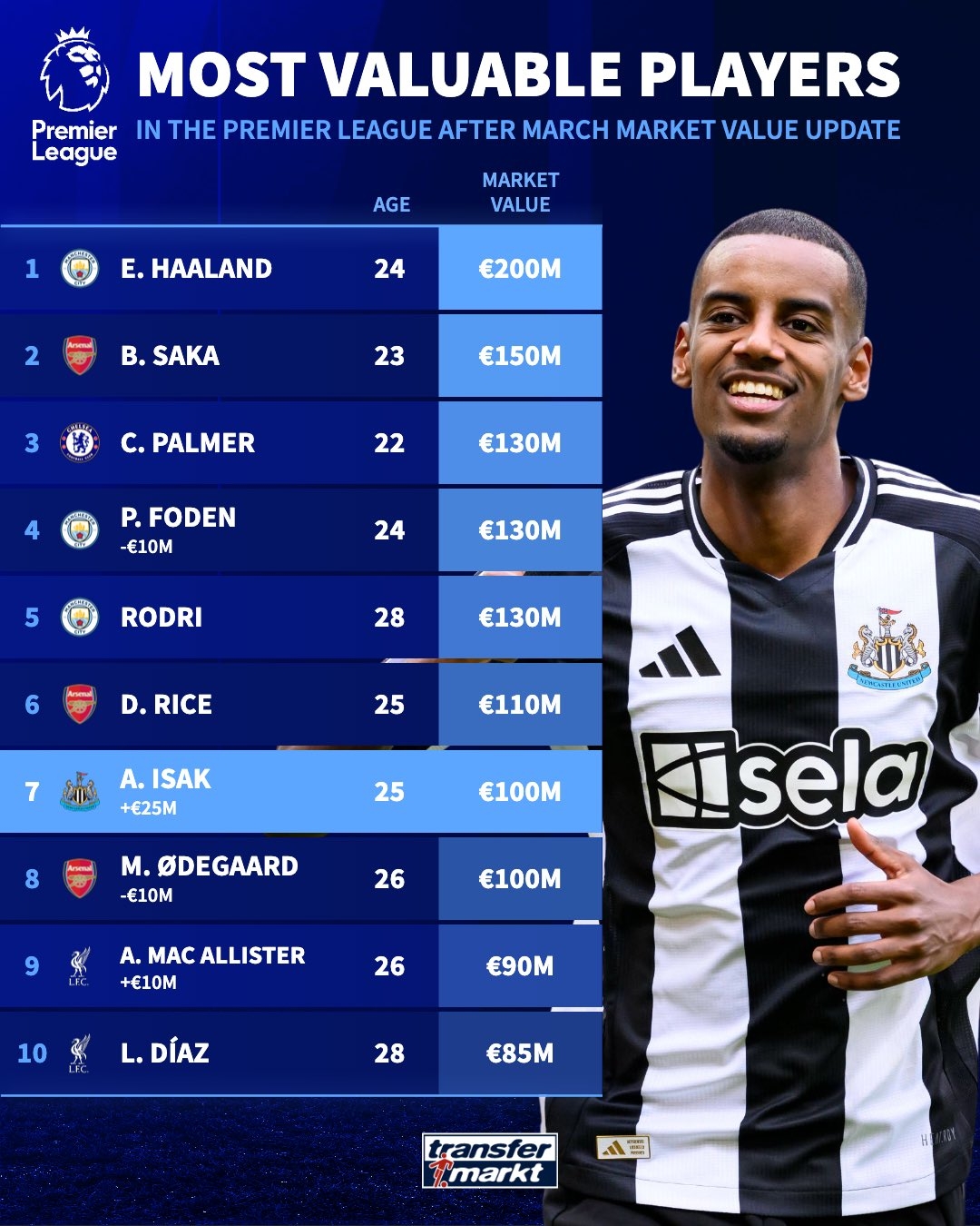 03月18日訊 德轉(zhuǎn)更新英超身價(jià),前二哈蘭德、薩卡不變,多位利物浦球員身價(jià)增長,一些曼城、阿森納球員的身價(jià)小幅下跌,伊薩克、17歲恩瓦內(nèi)里(本月21日將年滿18歲)的身價(jià)迎來暴漲。