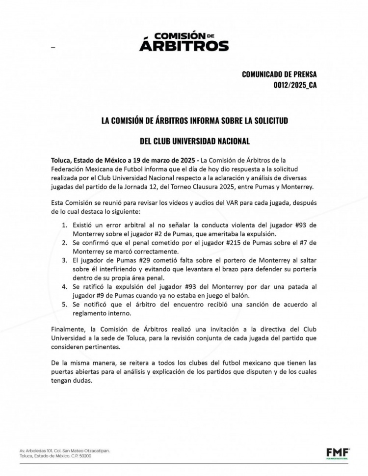 墨西哥美洲獅俱樂部賽后提出申請,希望墨西哥裁判委員會對比賽中的判罰做出澄清和分析,裁判委員會發布公告,確認當值主裁存在失誤,拉莫斯上半場肘擊對手就應該被罰下,但裁判沒有對其出示紅牌。