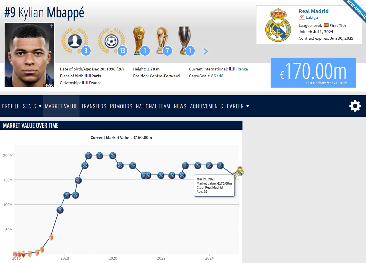 26歲姆巴佩生涯身價走勢:加盟皇馬先下跌后回漲至1.7億,巔峰2億