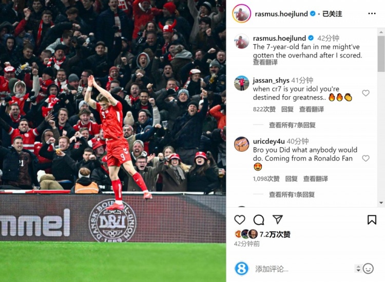 霍伊倫在社交媒體上曬出自己慶祝的照片,配文:“藏在我心里的那個7歲小球迷,進球后可能接管了我。”