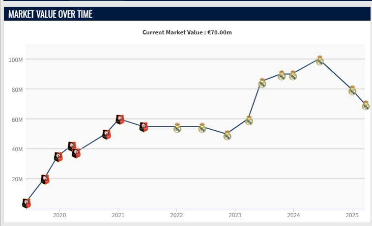 昨日德轉更新西甲球員身價,22歲的皇馬中場卡馬文加再降1000萬,最新身價為7000萬歐。