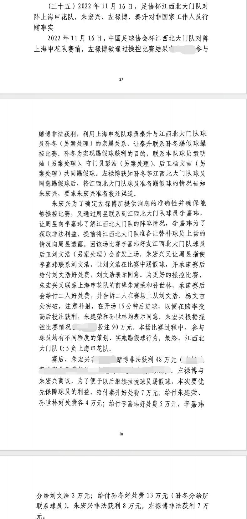 2022年11月16日,足協(xié)杯江西北大門隊對陣上海申花隊、朱宏興、左祿博、秦升對非國家工作人員行賄事實