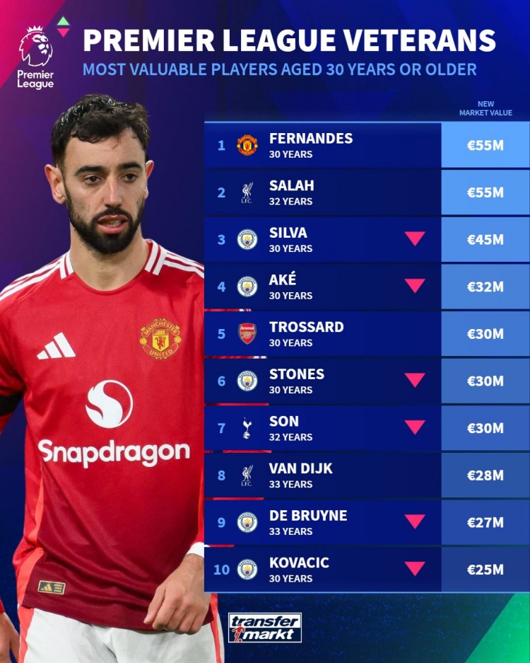 英超年齡30+球員身價榜:B費、薩拉赫5500萬歐居首,B席第三