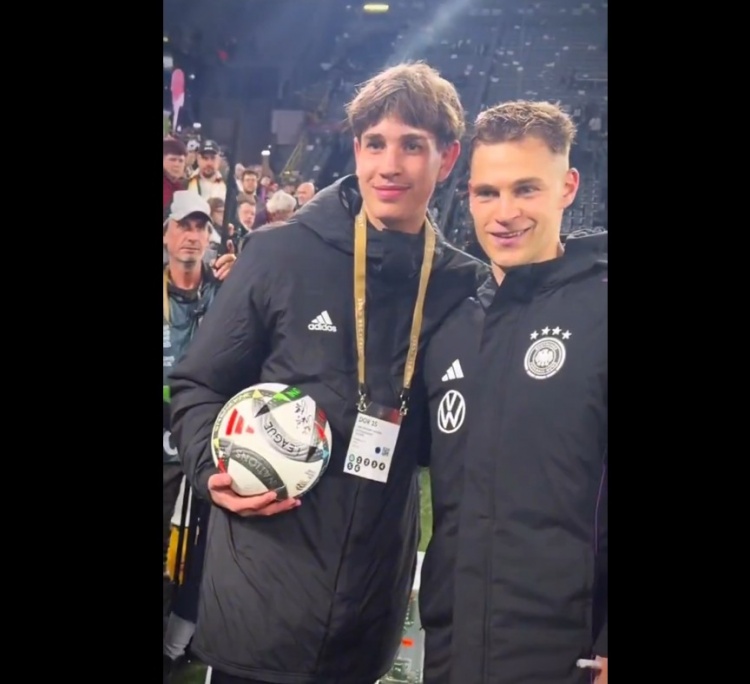 德國球童助力快發角球破門,基米希賽后送上簽名足球并合影鼓勵