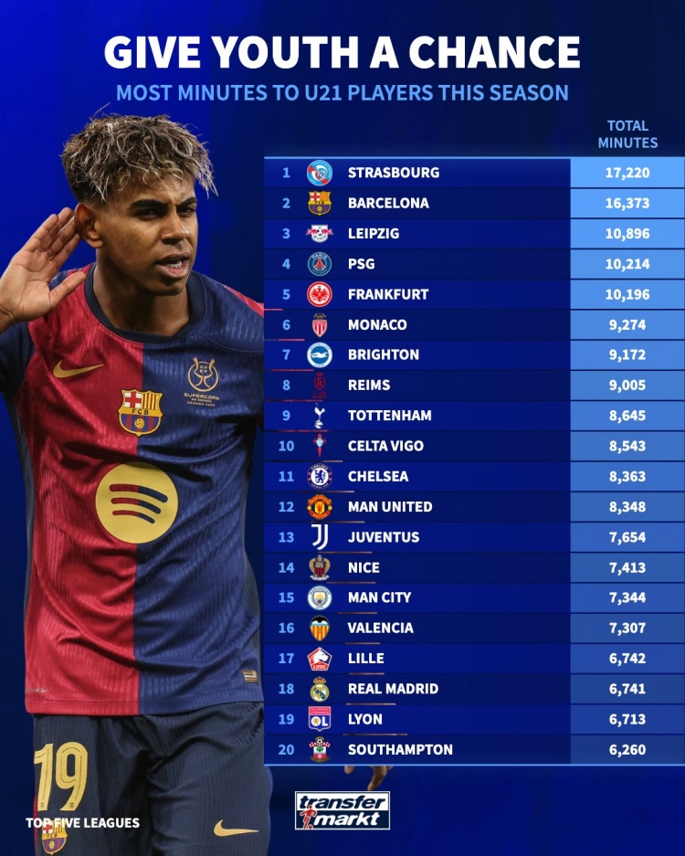 本賽季五大聯賽球隊U21球員出場時間排行榜↓(單位:分鐘)