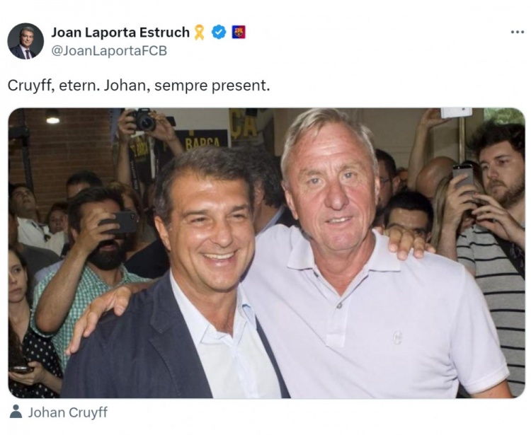 3月25日訊 巴薩俱樂部主席拉波爾塔更新社媒動(dòng)態(tài),悼念克魯伊夫。