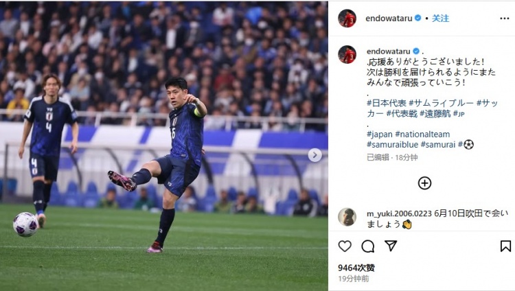 3月25日訊 世預賽18強賽C組第8輪,日本隊主場0-0與沙特隊戰平,不過日本隊已經提前晉級2026世界杯。賽后,日本隊中場遠藤航更新社媒。