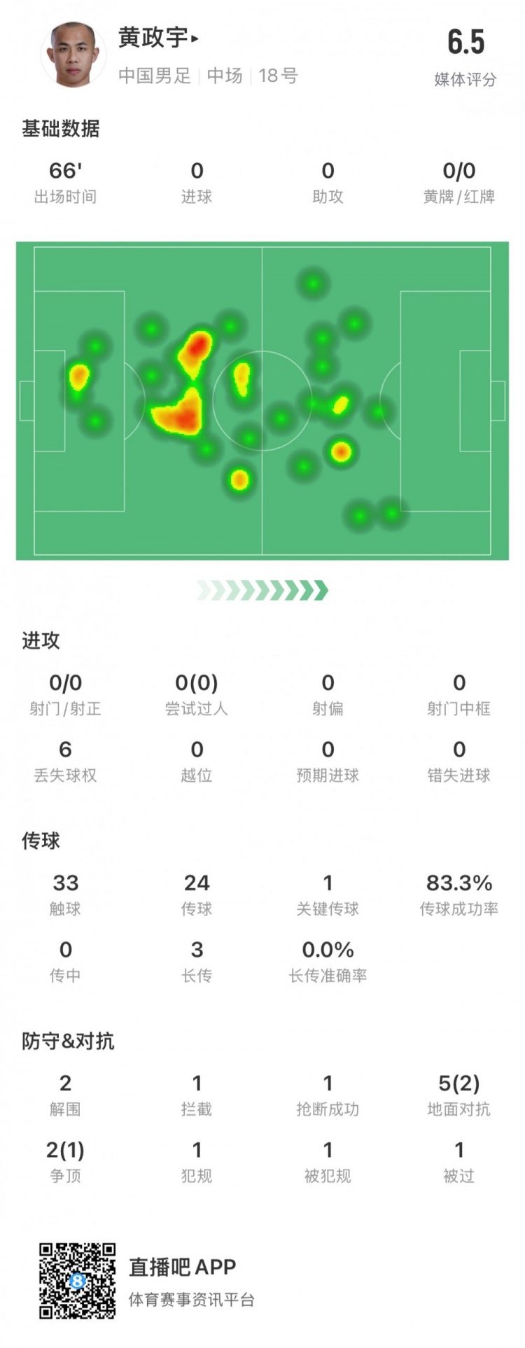 3月25日訊 今晚國足主場對陣澳大利亞,第66分鐘首發后腰黃政宇被換下,此役黃政宇數據如下: