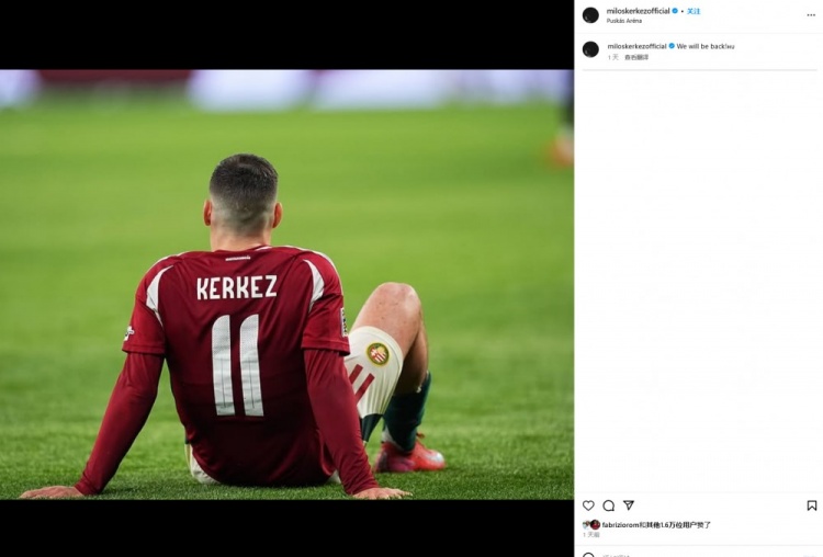 匈牙利本次國際比賽日兩戰皆墨,兩回合1-6輸給了土耳其,科爾克茲曬出自己的照片,并寫道:“我們會回來的!”