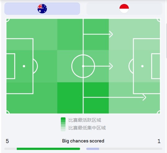澳大利亞玩的就是效率,控球率、進攻三區進入次數比印尼還少,可比分卻是大勝(藍色方為印尼)