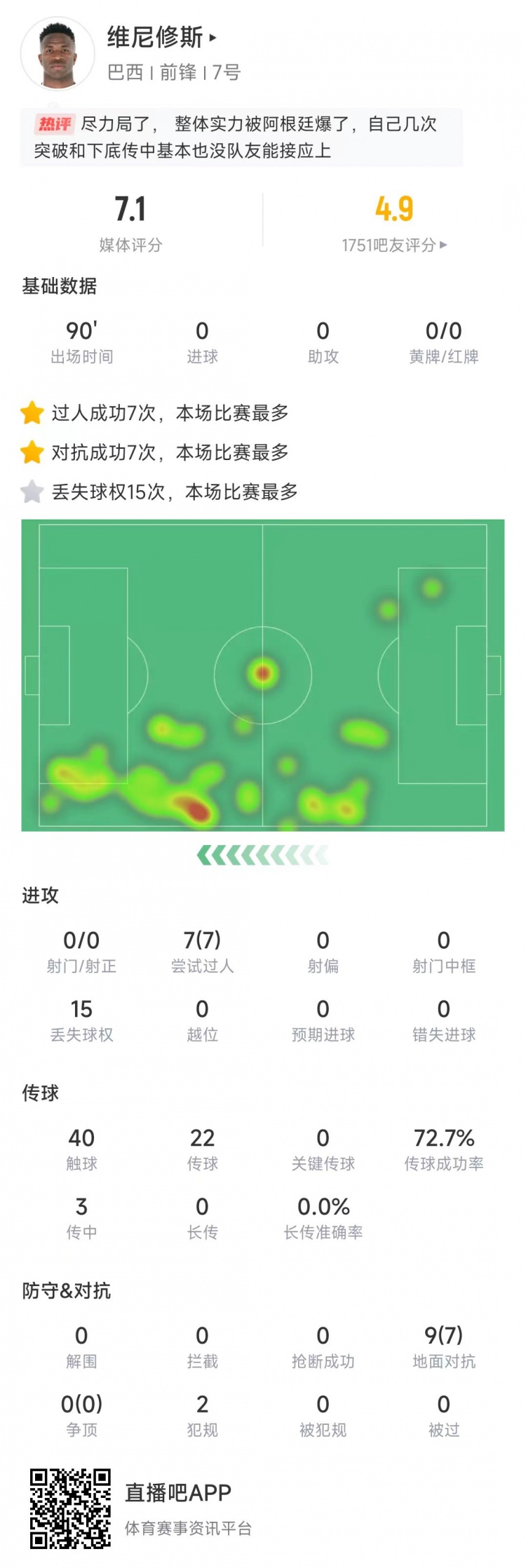 維尼修斯本場數據:踢滿90分鐘0射門,7次成功過人全場最多