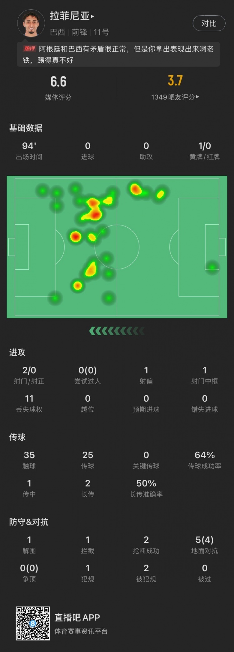 白放狠話了?拉菲尼亞本場:2射0正1中框,1黃牌,5次對抗成功4次