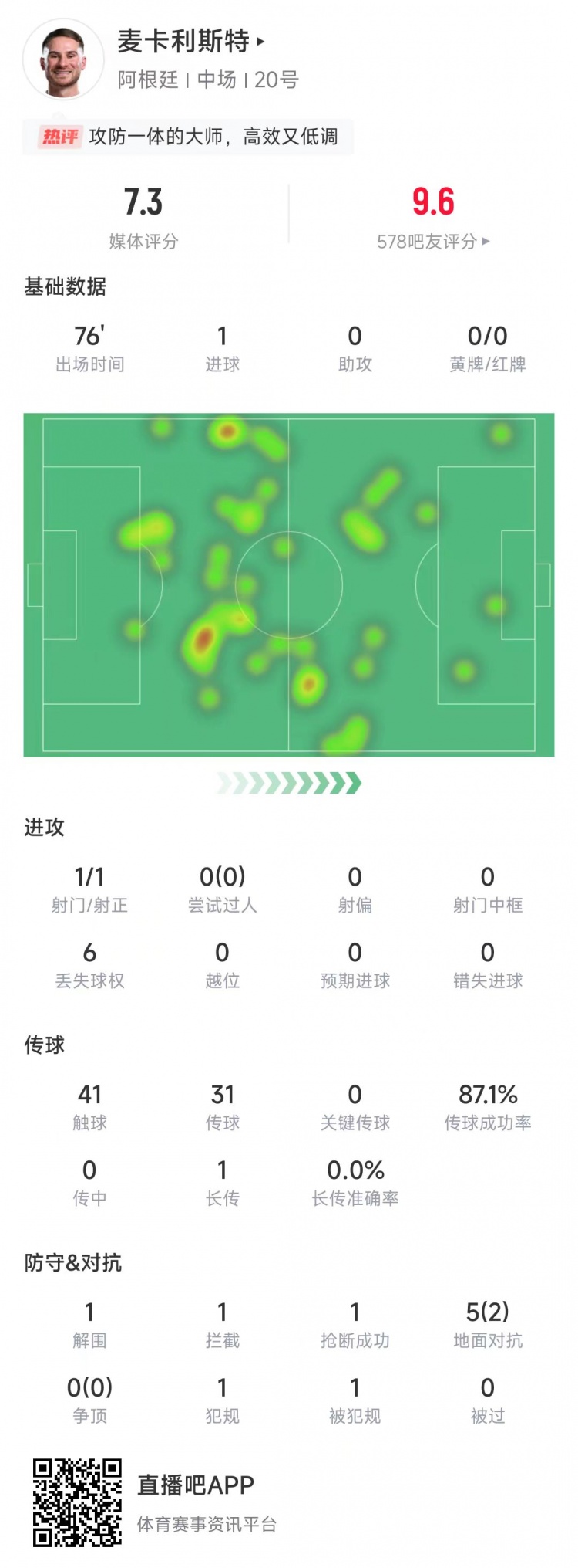 麥卡利斯特本場數據:射門1次打進1球,傳球成功率87.1%&評分7.3