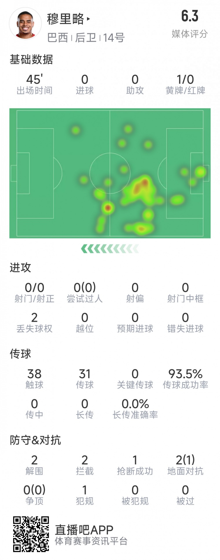 半場(chǎng)被換下,穆里略本場(chǎng)數(shù)據(jù):兩次烏龍助攻,2解圍&2攔截