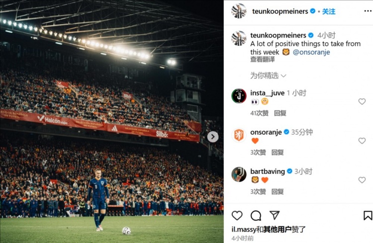 庫(kù)普梅納斯在社交媒體上寫道:“這一周發(fā)生了許多積極的事情。”乍一看似乎是對(duì)莫塔的暗諷,但庫(kù)普梅納斯標(biāo)注了荷蘭隊(duì),并且配圖也是荷蘭國(guó)家隊(duì)的賽場(chǎng)照,因此可以認(rèn)為他是在談?wù)摵商m的歐國(guó)聯(lián)之旅。