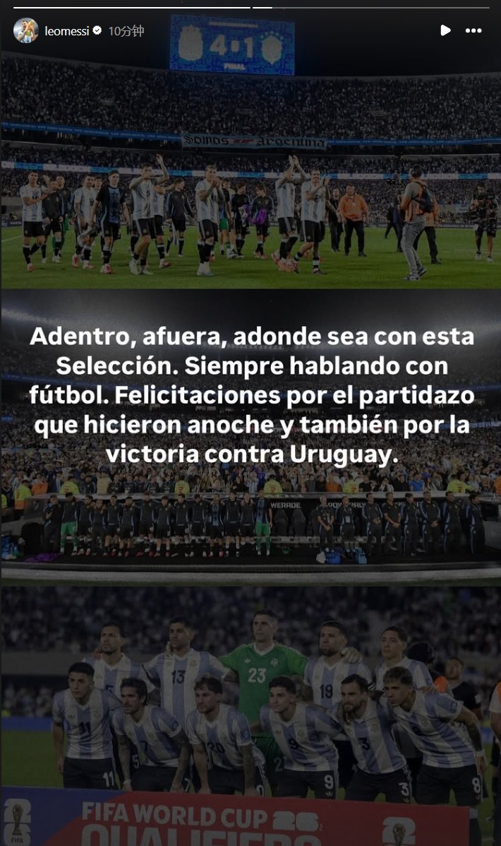 梅西寫道:“無論在任何地方,這支國家隊總是用足球說話。祝賀你們昨晚踢出了一場精彩的比賽,也祝賀你們之前戰勝了烏拉圭。”