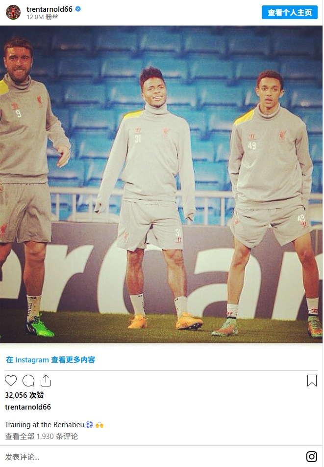 這是阿諾德首次從伯納烏的球員通道走出,他毫不猶豫在INS上發布了和斯特林以及蘭伯特在一起的照片并配文道:在伯納烏進行訓練。