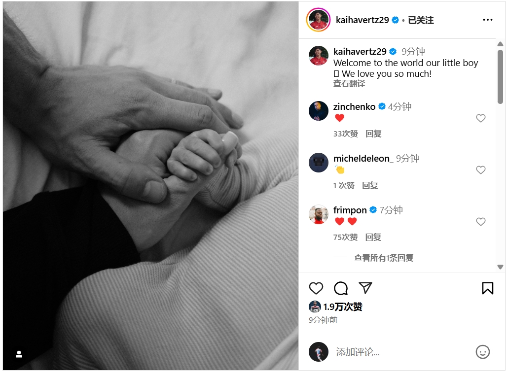 喜得貴子!哈弗茨社媒宣布當?shù)簹g迎來到這個世界,我們愛你