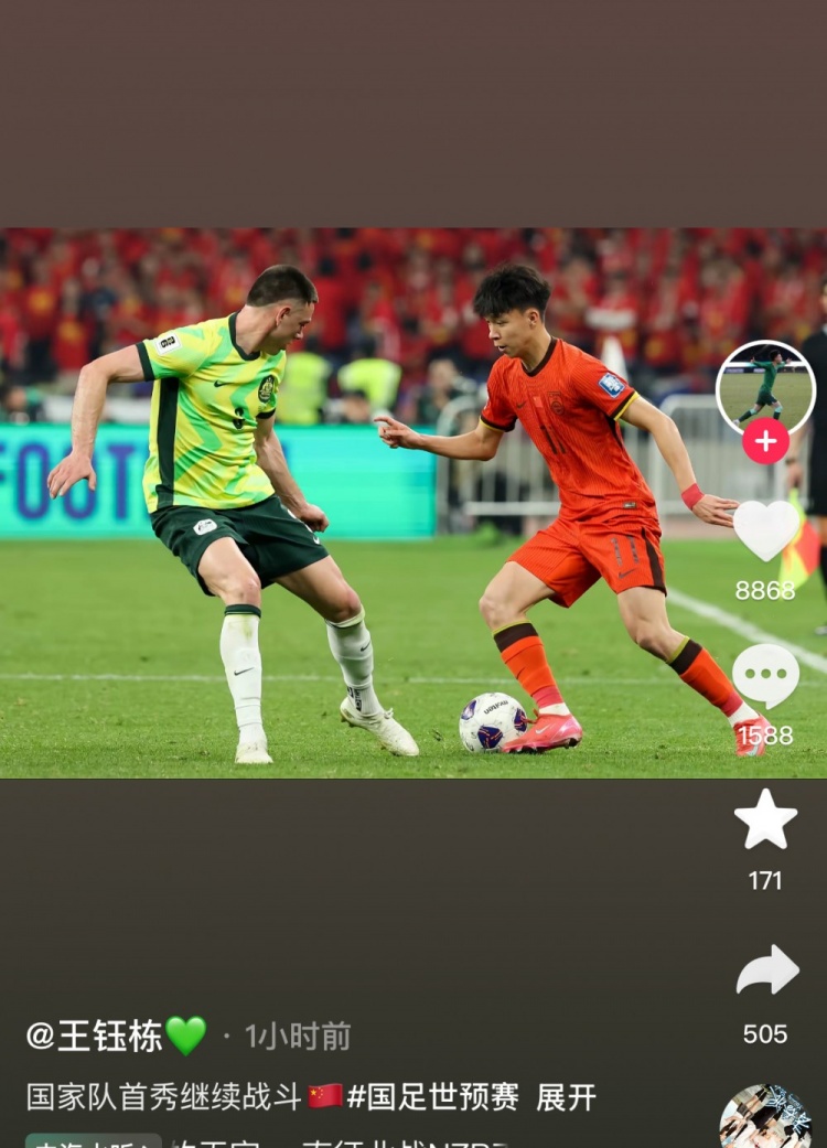 昨晚國足主場0-2不敵澳大利亞的比賽中,王鈺棟在下半場替補出場,兩次成功過人位居全場之首。