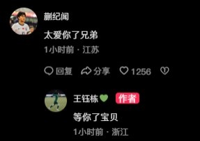 他在U20國足的隊友蒯紀聞留言“太愛你了兄弟”,王鈺棟則調侃回復“(國家隊)等你了寶貝”。