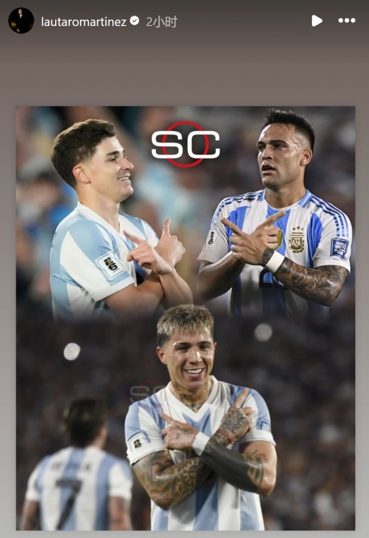 本場比賽勞塔羅因傷缺戰,而阿爾瓦雷斯、恩佐在進球后都做出了勞塔羅標志性慶祝動作。勞塔羅也在個人社媒轉發了三人進球后同樣的慶祝動作照片。