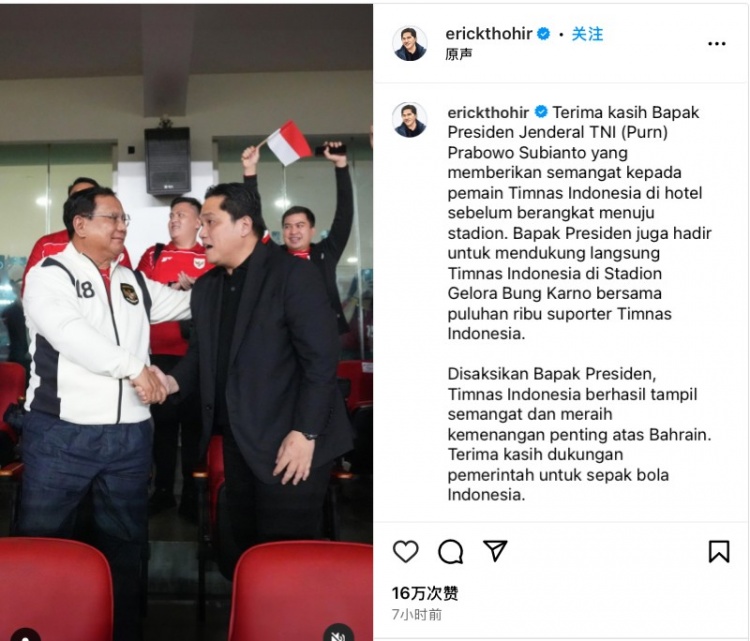 賽后印尼足協主席托希爾更新社媒,曬出了印尼總統蘇比延多親臨現場觀戰的Vlog,并配文寫道: