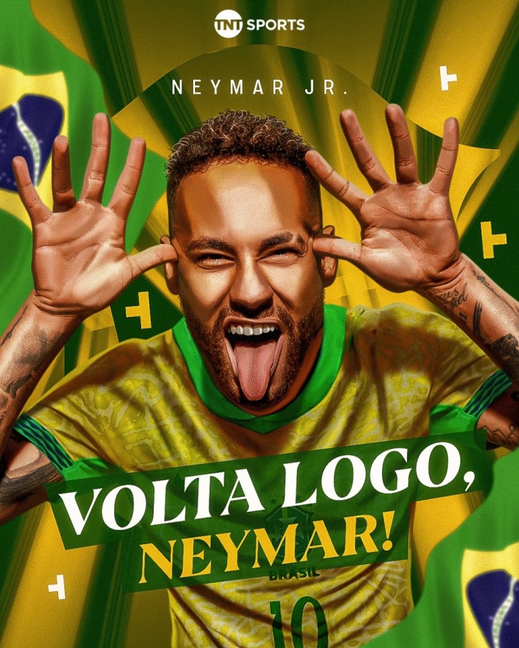 內馬爾因傷退出本期巴西隊名單,TNT巴西在社交媒體上曬出內馬爾的海報,配文:“真想念你啊,球星!內馬爾沒有參加這次國際比賽日的比賽,但我們真的很想再次看到他穿上巴西隊的球衣,他真是太令人想念了!”
