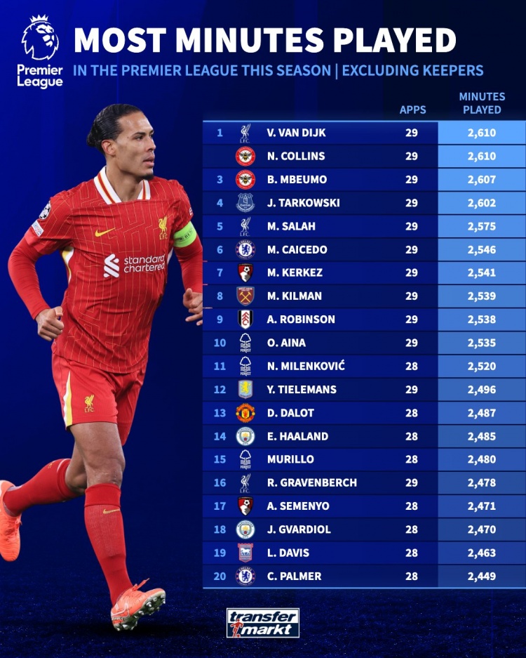 3月27日訊 德轉統計了本賽季出場時間最多的20名英超外場球員(即非門將球員)。其中,范迪克和科林斯打滿29場比賽居首,薩拉赫第5、凱塞多第6。