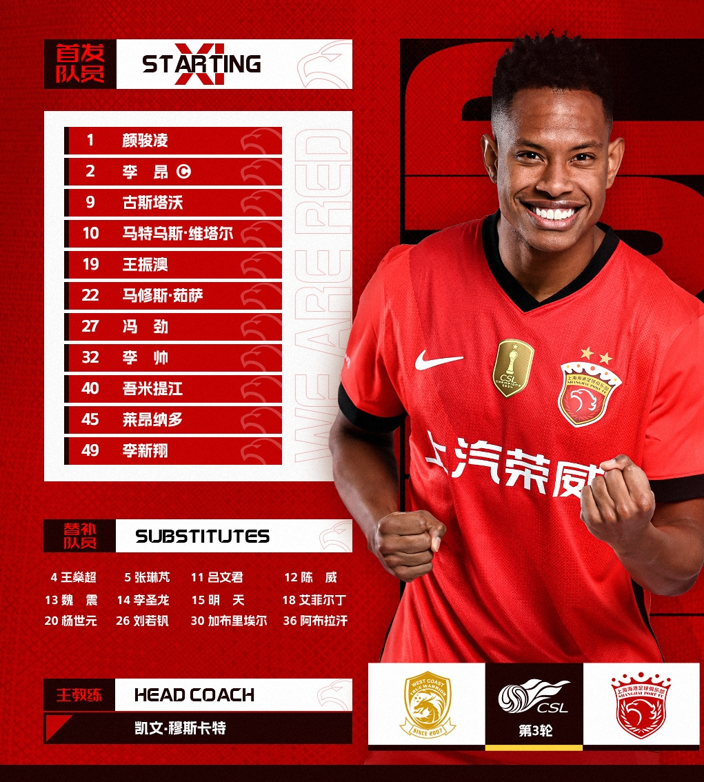 中超聯賽第3輪,青島西海岸vs上海海港,今日首發名單
