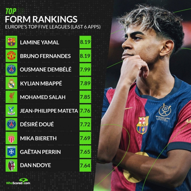 3月28日訊 國(guó)家隊(duì)比賽周已經(jīng)結(jié)束,whoscored統(tǒng)計(jì)了五大聯(lián)賽此前6輪的場(chǎng)均評(píng)分情況,亞馬爾和B費(fèi)并列居首。