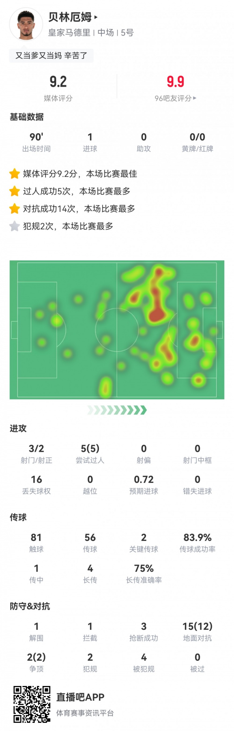 3月30日訊 本輪西甲,皇馬3-2萊加內(nèi)斯。此役貝林厄姆首發(fā)打滿(mǎn)全場(chǎng),球員全場(chǎng)重點(diǎn)數(shù)據(jù)如下↓
